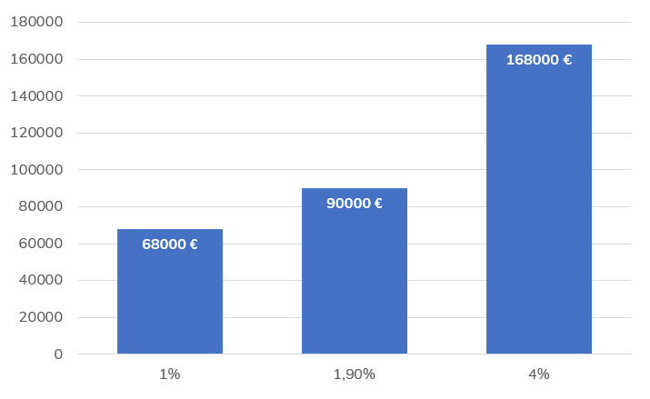 Stelle Dir vor, wie die jährlichen Ausgaben im Wert von 50.000 Euro von 1992 bis 2021 gestiegen sind und welchen Unterschied eine kleine Änderung der Inflationsrate in diesem Zeitraum gemacht hätte: